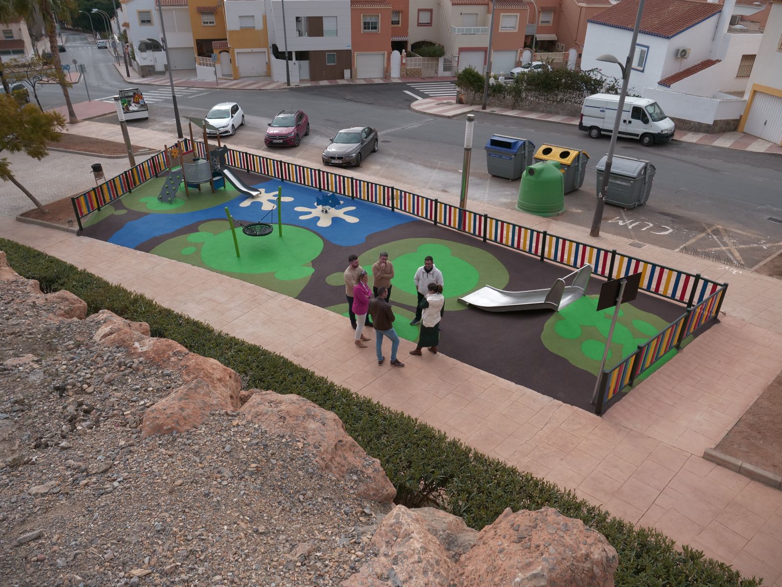 El alcalde de Roquetas de Mar, Gabriel Amat, junto con la concejal de Protección de Medio Ambiente y Zonas Verdes, Susi Ibáñez, se han desplazado hasta la barriada de La Rocalla para comprobar los trabajos de remodelación integral que se han llevado a cabo en el área infantil que se ubica entre la calle Jade y la calle Esmeralda.