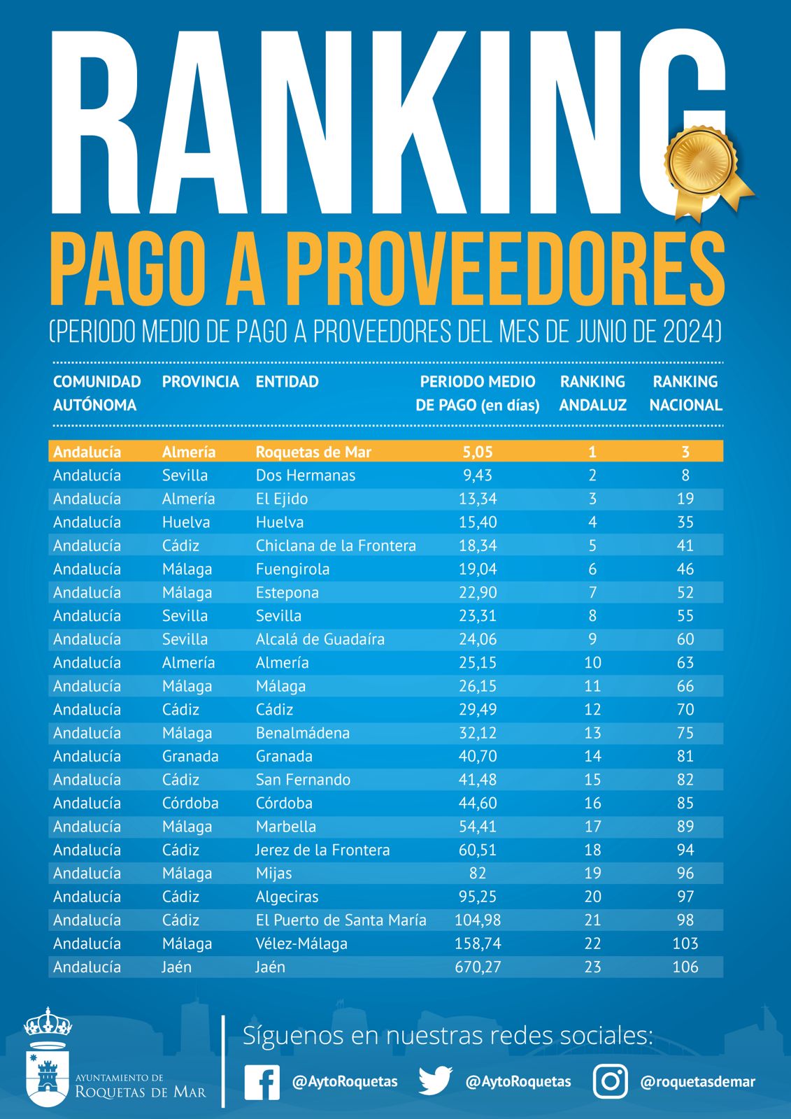 Según el informe publicado por el Ministerio de Hacienda correspondiente al mes de septiembre, el Ayuntamiento de Roquetas ocupa la primera posición en el ranking andaluz y la tercera posición en el nacional. A Roquetas de Mar le siguen ayuntamientos como el de Dos Hermanas en Sevilla, con un periodo medio de pago de 9,43 días, el de El Ejido con 13,34 días o el de Huelva con 15, 40 días.