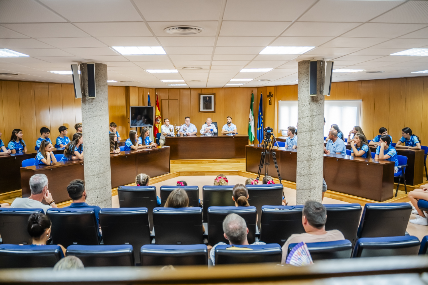 El alcalde de Roquetas de Mar, Gabriel Amat, acompañado del concejal de Deportes, José Juan Rubí, y del concejal delegado de Cultura, Daniel Salcedo, ha recibido en el salón de plenos a los entrenadores y niños y niñas del Club Deportivo Al-Bayyana para felicitarlos por sus éxitos deportivos durante este año.
