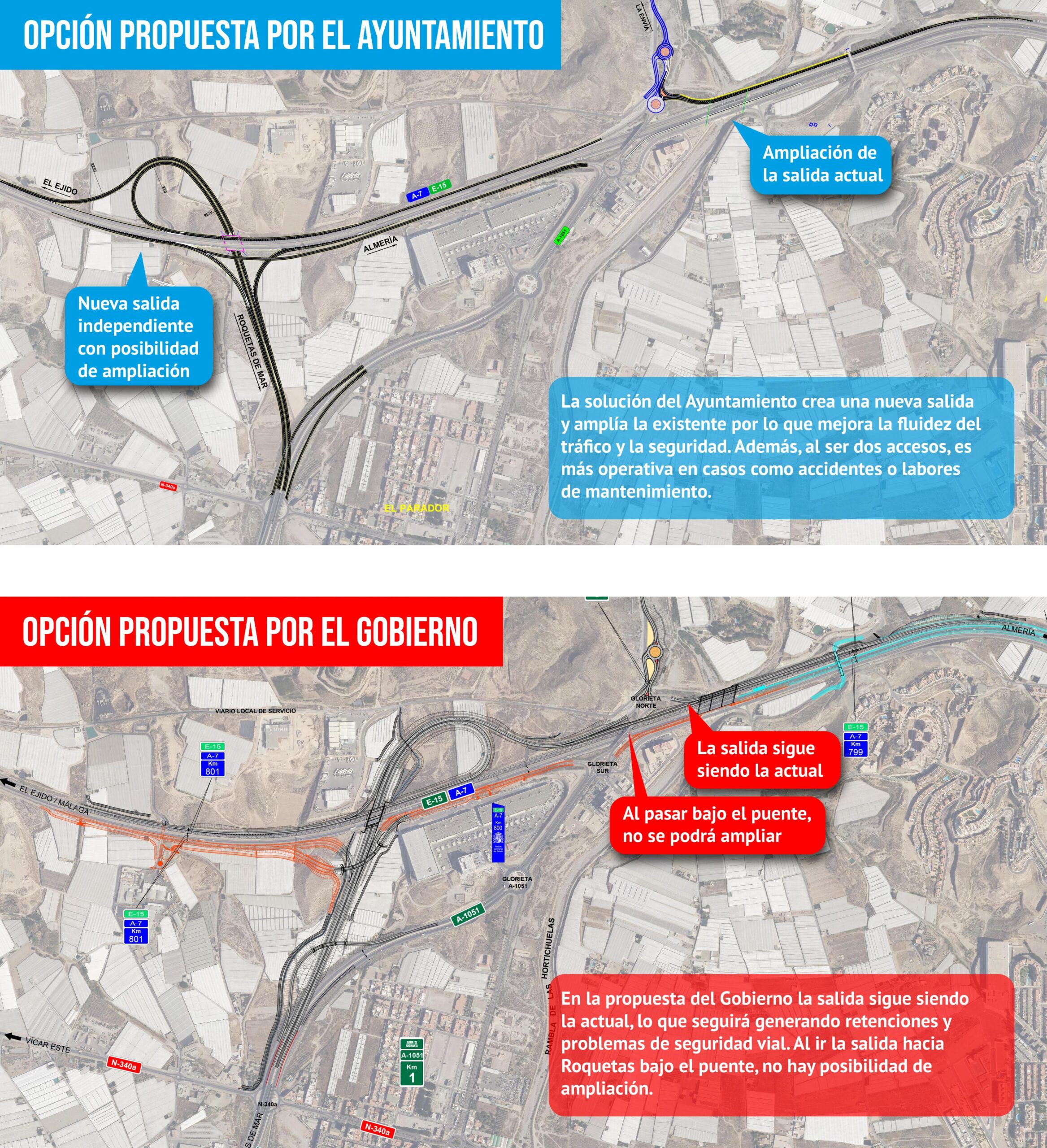 Además, desde el Consistorio insisten en que la solución que da el Gobierno mantiene la salida actual, por lo que no se da solución a las retenciones y largas colas que se forman diariamente. “La solución que proponemos evitaría los problemas de tráfico actuales descongestionando el tráfico y permitiría una futura ampliación si fuese necesario. La entrada por debajo del puente de un solo carril no es la vía de acceso adecuada para una ciudad en constante crecimiento como Roquetas de Mar y que alcanza los 200.000 habitantes durante el verano”, aclara el alcalde.