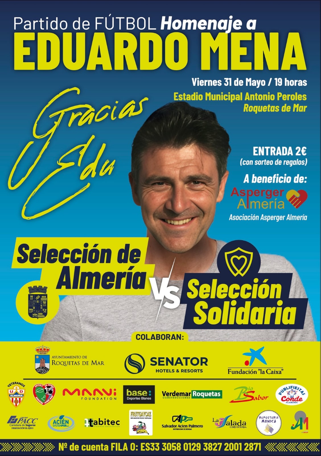 https://youtu.be/aejpbUUw_R8El Estadio Antonio Peroles de Roquetas de Mar acogerá el próximo viernes 31 de mayo el partido de fútbol a beneficio de Asperger Almería que se ha organizado en homenaje a Eduardo Mena, ex futbolista profesional, entrenador y uno de los preparadores personales más prestigiosos del país que falleció a la edad de 56 años