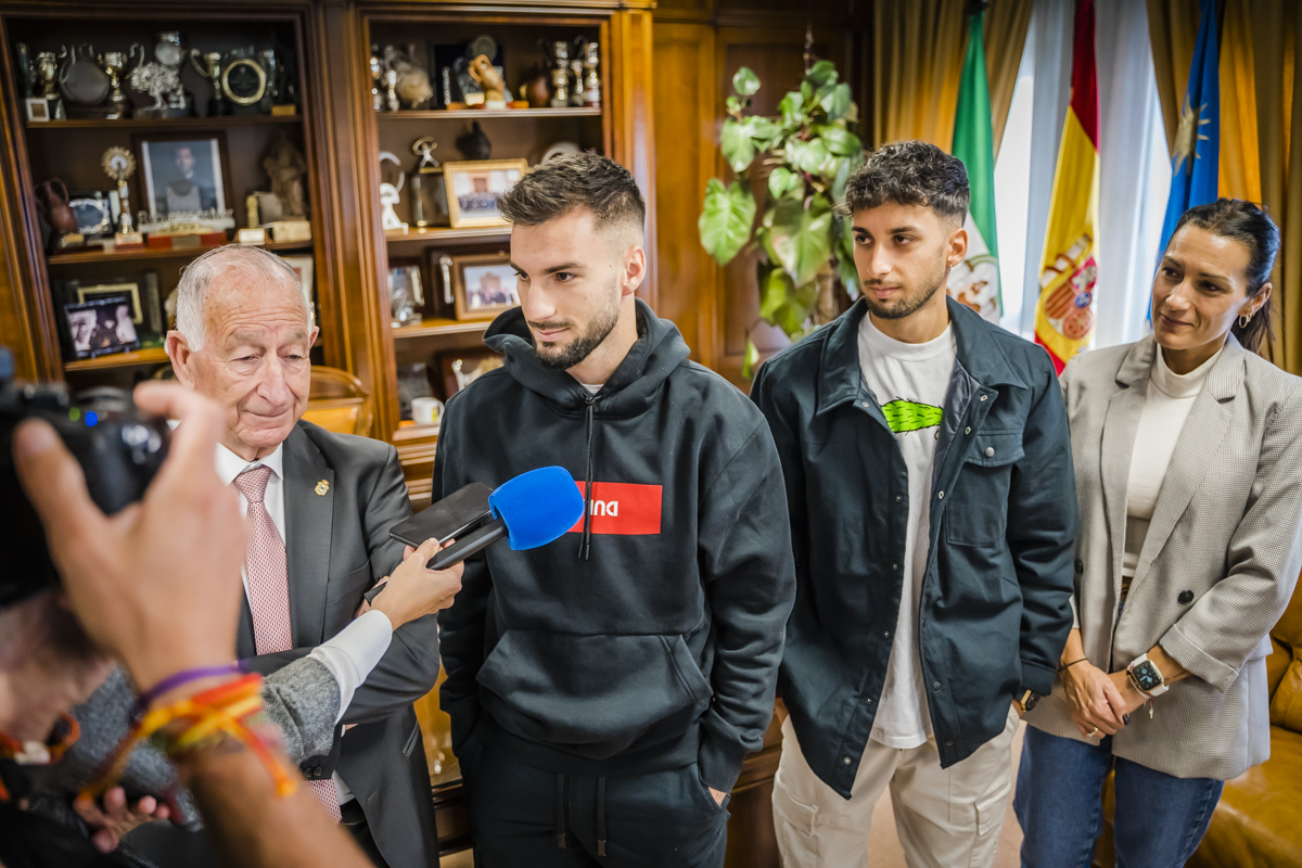 El alcalde de Roquetas de Mar, Gabriel Amat, junto al concejal de Deportes y Tiempo Libre, José Juan Rubí, ha recibido en su despacho al jugador roquetero, Álex Baena, que en la actualidad juega en el Villareal C.F. En este encuentro, el joven jugador, que ha estado acompañado por su madre y su hermano, ha tenido la oportunidad de abordar con el alcalde el transcurso de la temporada que está llevando a cabo en este equipo que, en este momento, se sitúa en la novena posición de la liga.