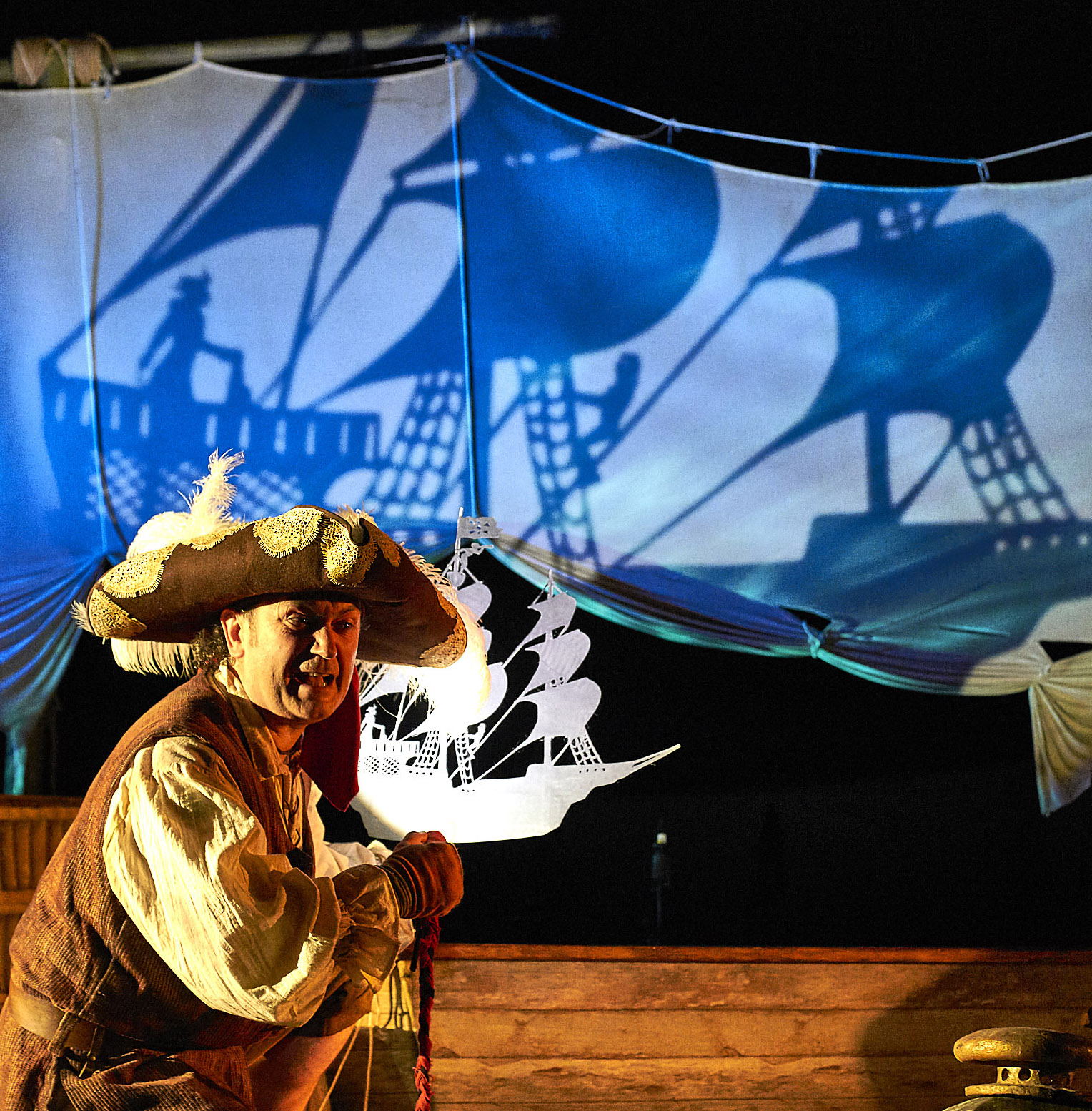 Para la adaptación de la obra literaria al teatro, A la Sombrita emplea distintas técnicas de luces y sombras con las que José Diego Ramírez (Autor e intérprete manipulador) ha ido investigando y perfeccionando desde que en 1993 estrenará su primer trabajo. Así pues, en el transcurso de la representación se podrán ver sombras corporales, siluetas articuladas, pop-up, objetos superpuestos para crear decorados y títeres articulados que representan a los diferentes protagonistas de esta emocionante historia de piratas.