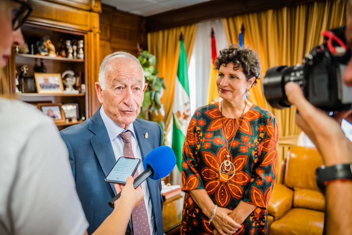 La delegada de Justicia, Administración Local y Función Pública, Carmen Navarro, ha realizado una primera visita al Ayuntamiento de Roquetas de Mar, donde ha sido recibida por su alcalde, Gabriel Amat.