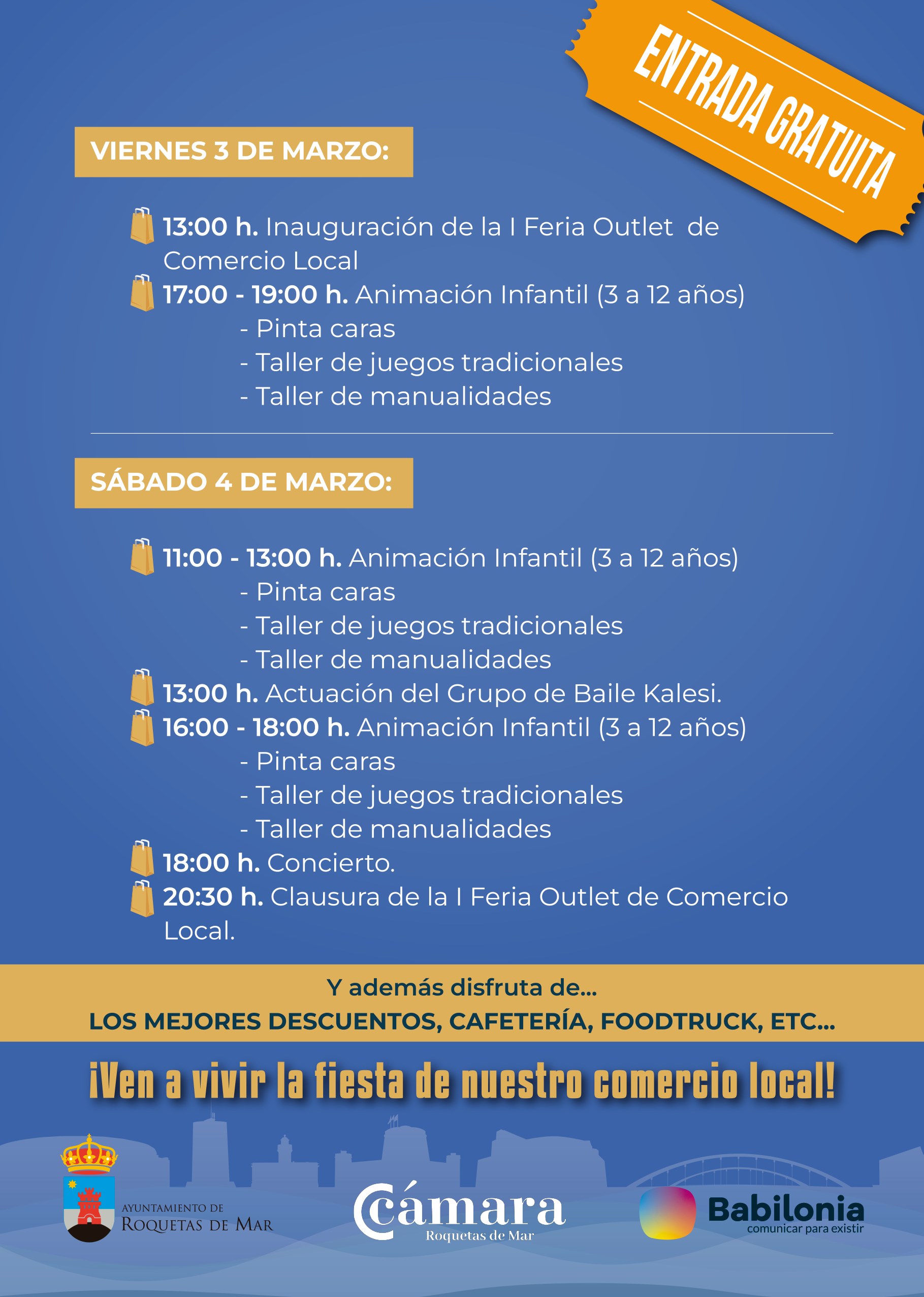 El Ayuntamiento de Roquetas de Mar celebra los próximos 3 y 4 de marzo la I Feria Outlet del Comercio Local de Roquetas de Mar. Una iniciativa desarrollada desde el Área de Comercio del Ayuntamiento de Roquetas de Mar en colaboración con la Cámara de Comercio de Almería que tendrá lugar en el Palacio de Congresos de Aguadulce.