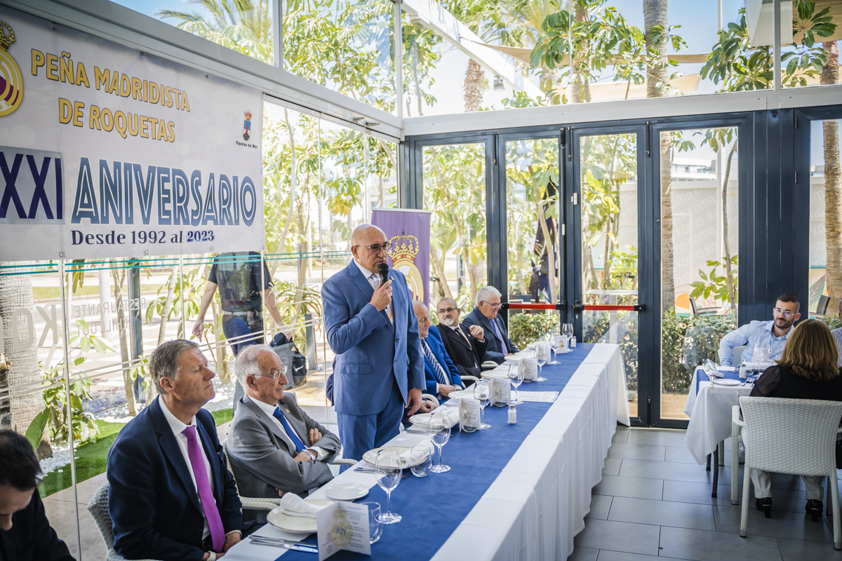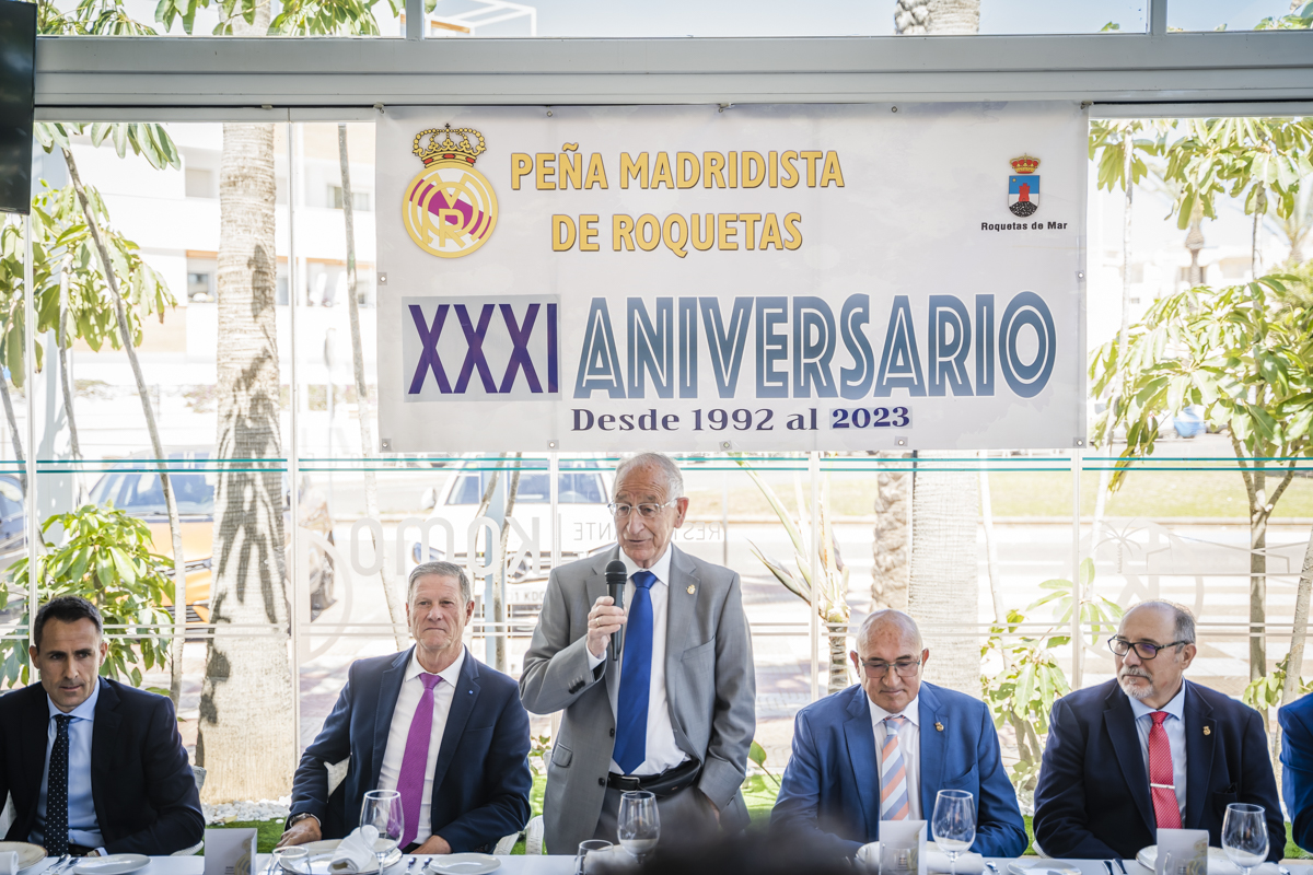 Un año más los socios de la Peña Madridista de Roquetas de Mar han celebrado su tradicional comida con la que se conmemora el XXXI aniversario de su fundación. El alcalde de Roquetas de Mar, Gabriel Amat, asistió a este encuentro que contó con la presencia de el exfutbolista español, Francisco Bonet Serrano, defensa del Real Madrid desde 1982 a 1986.