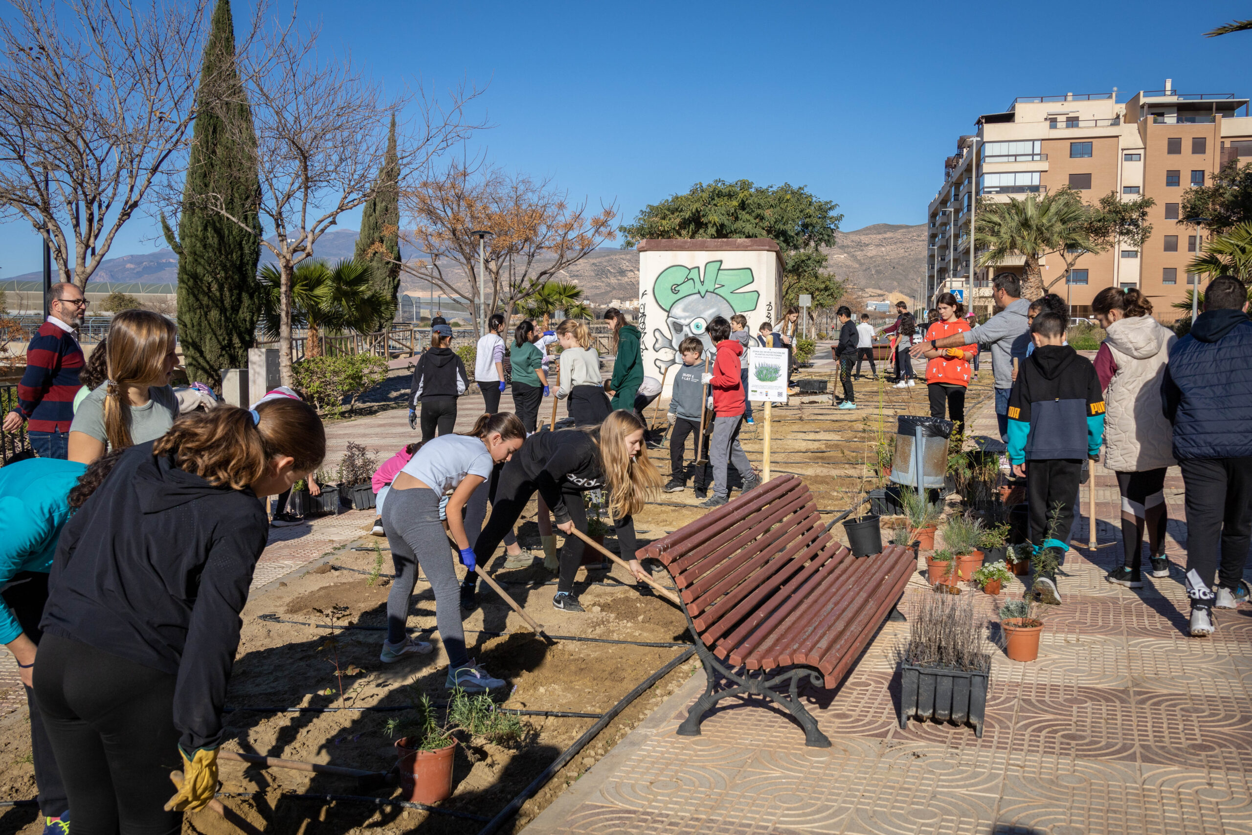 Más de 50 escolares del colegio Arco Iris repoblan con vegetación autóctona la Rambla de El Parador