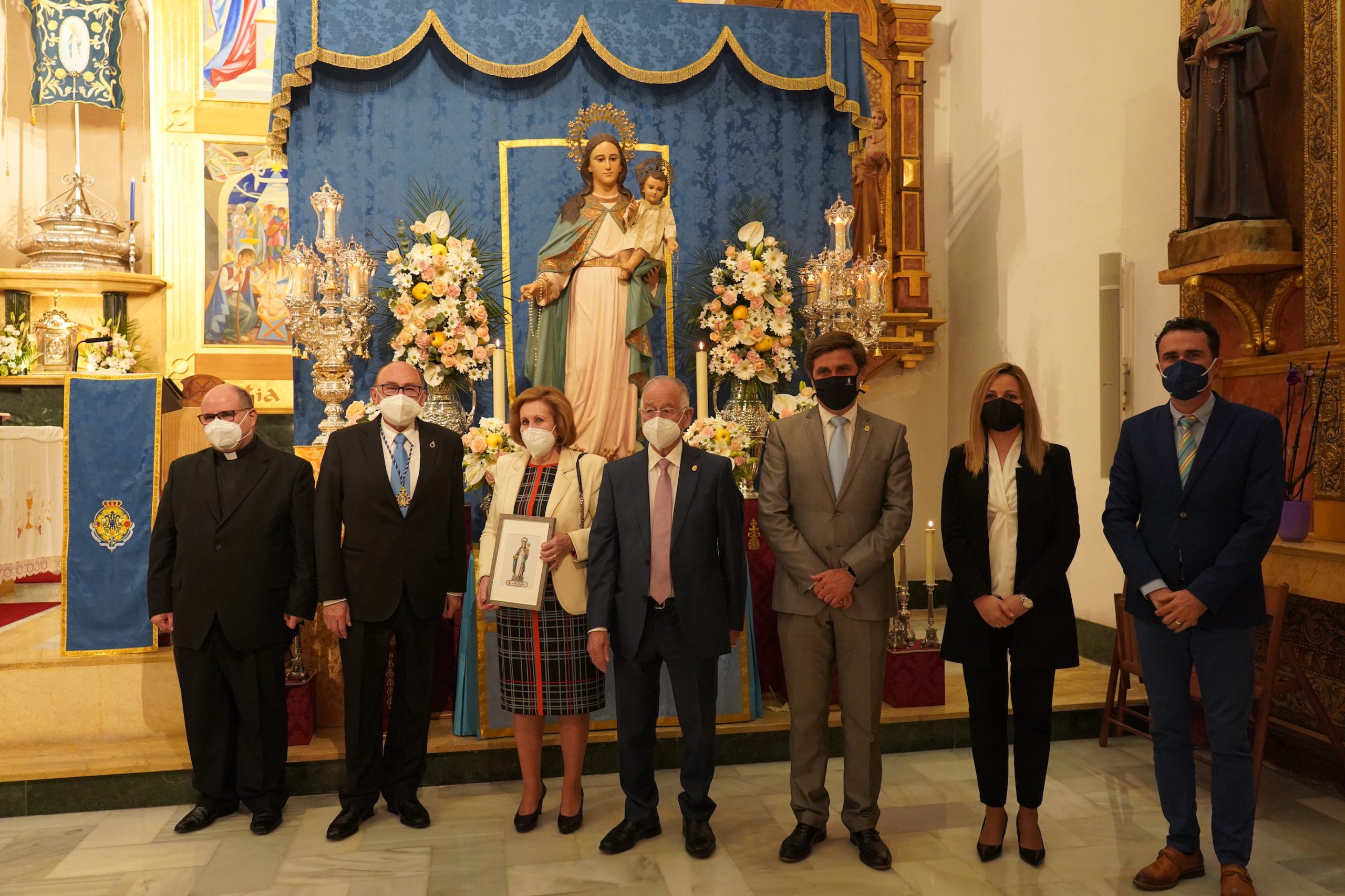 Como cierre de la ceremonia, se entregaron varios reconocimientos, con los que la Hermandad quiso agradecer el apoyo de personas y entidades que han colaborado para conseguir este proyecto. Entre los distinguidos estaban el responsable de la obra de restauración Joaquín Gilabert, el profesor y fotógrafo Blas Fuentes, la Cofradía Nuestra Señora de los Dolores, el párroco Antonio Mata, quien recibió un emotivo recuerdo para su madre, que no pudo asistir, y los hermanos fundadores Gabriel Amat y María Pintor. Gabriel Amat, alcalde de Roquetas, quiso agradecer la distinción e intervino para felicitar al artista restaurador por un trabajo, en el que “se ha conseguido recuperar la imagen de la Virgen del Rosario como ella es, muy guapa y muy querida por todos los roqueteros”. El primer edil elogió también, tanto a la Hermandad de Nuestra Señora del Rosario como a la Parroquia, por “el trabajo e ilusión que han puesto en llevar a cabo este maravilloso proyecto, que ya queda para que pueda disfrutarlo todo el municipio”.