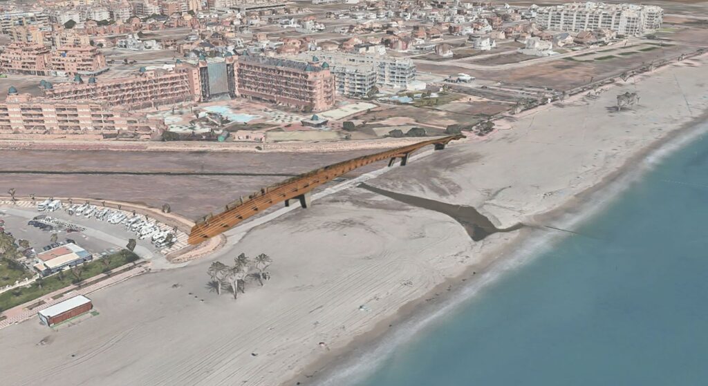 El puente proyectado, de aproximadamente 170 metros de longitud y estructura de madera, contará con dos o tres apoyos intermedios e incorporará una senda peatonal y un carril bici, lo que permitirá una conexión directa y segura entre ambas partes del paseo marítimo, cruzando la rambla sin necesidad de descender al cauce actual.