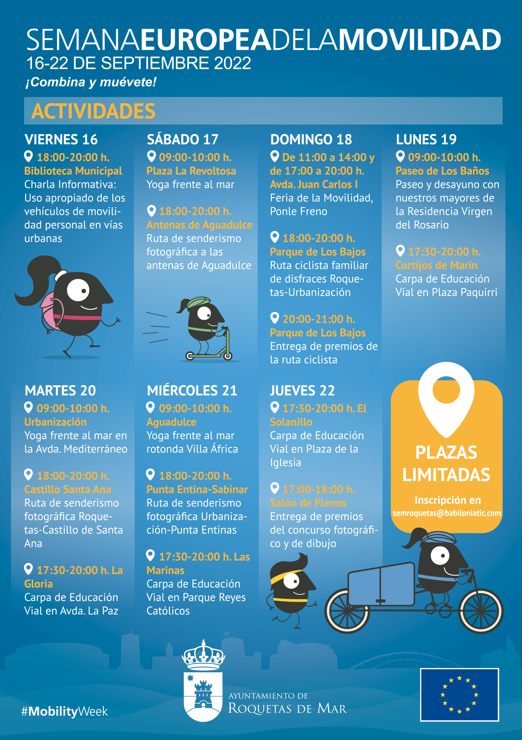 El Ayuntamiento de Roquetas de Mar, a través la concejalía de Presidencia, ha organizado una amplia programación de actividades con motivo de la Semana Europea de la Movilidad que se celebrará desde el 16 hasta el próximo 22 de septiembre. Este año, el tema elegido por la Comisión Europea es “Mejores conexiones” con el objetivo de seguir trabajando en el fomento de una movilidad urbana sostenible y el uso del transporte público.