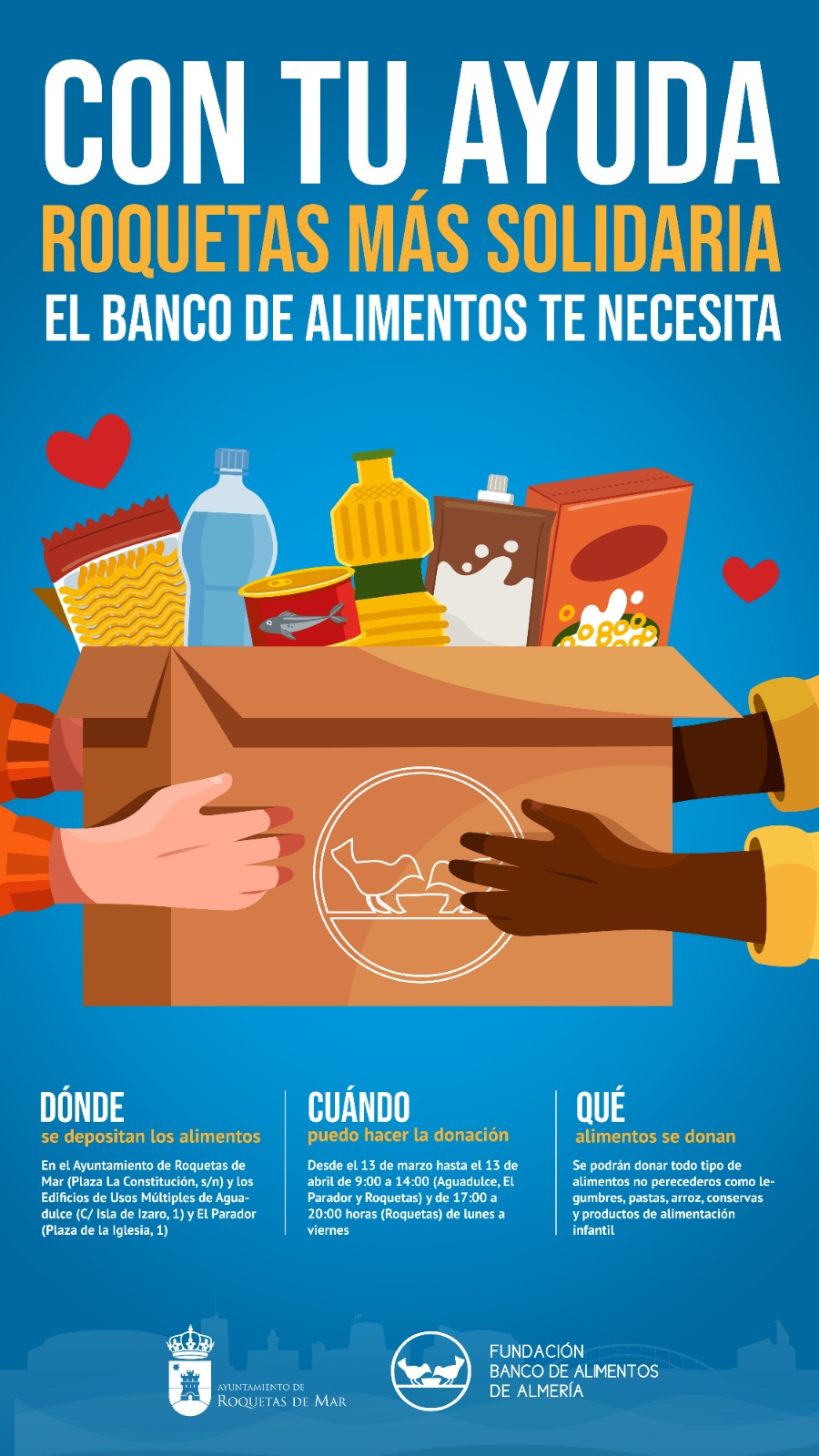Bajo el lema “Con tu ayuda, Roquetas más solidaria. El Banco de Alimentos te necesita”, el Ayuntamiento ha habilitado tres puntos de entrega para alimentos no perecederos durante todo un mes