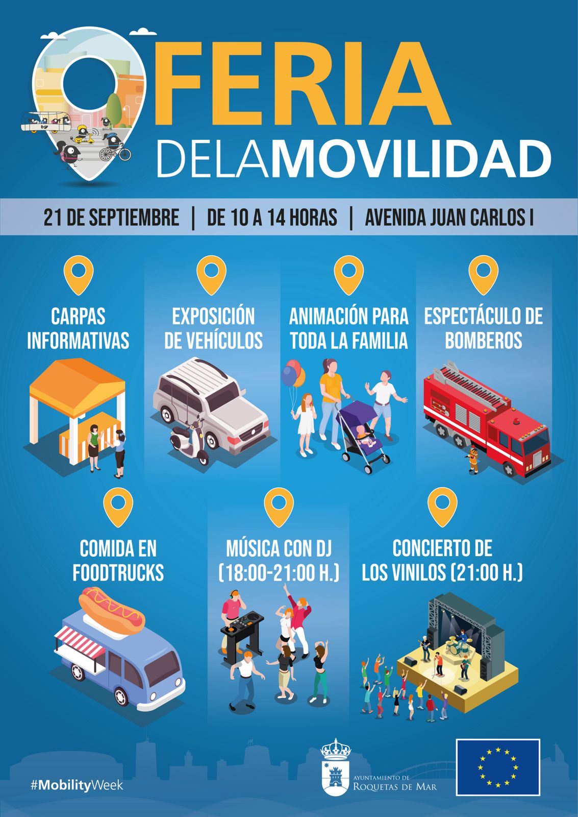 La Semana Europea de la Movilidad pondrá su broche de oro con la celebración de la tradicional de feria que se celebrará el sábado 21 de septiembre en la Avenida Juan Carlos I con carpas informáticas, exposición de vehículos, animación para toda la familia, espectáculo de bomberos, música con dj y conciertos de Los Vinilos.