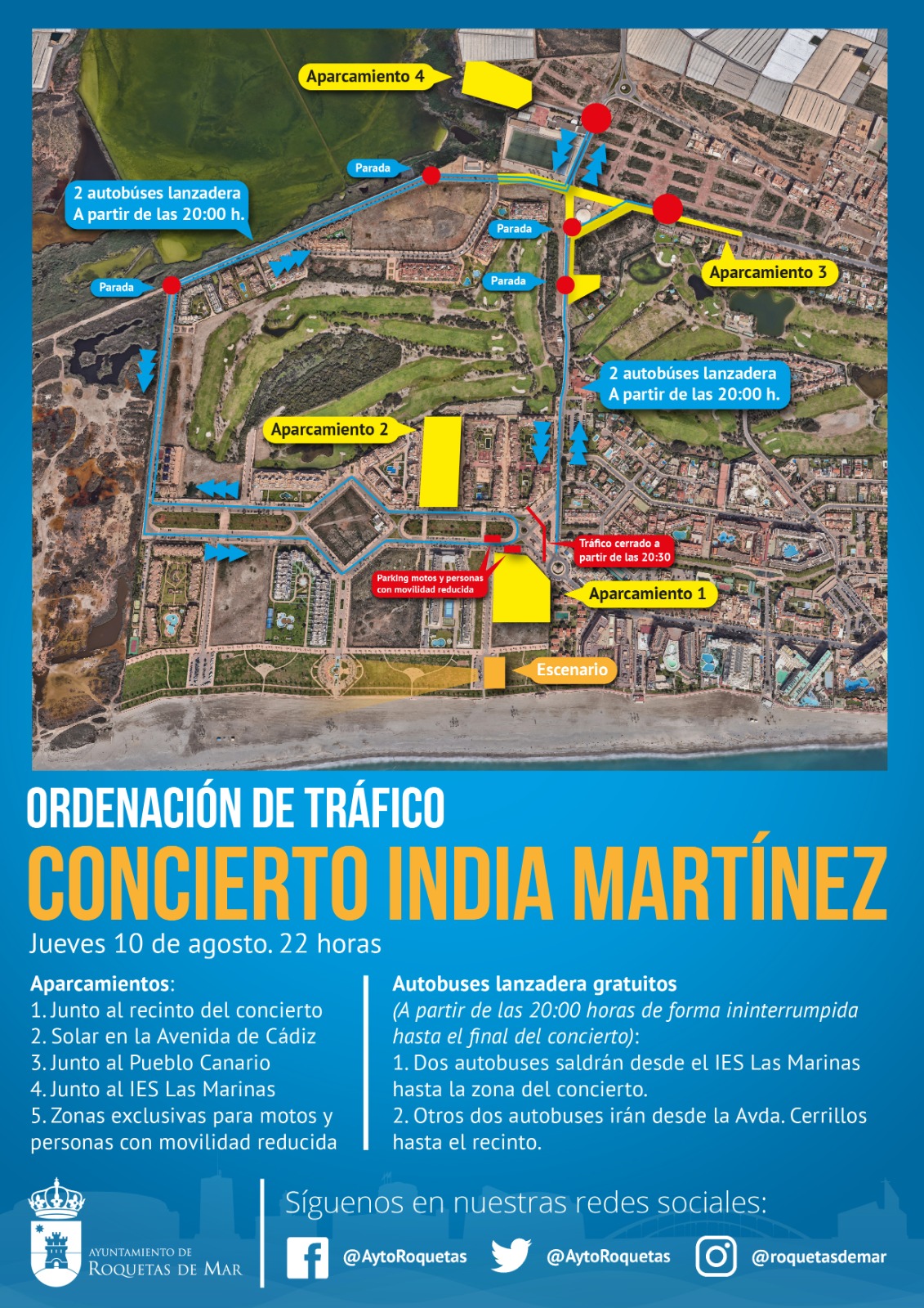 El Ayuntamiento de Roquetas de Mar ha concluido el dispositivo de seguridad para el concierto que India Martínez ofrecerá el próximo jueves a las 22:00 horas en Playa Serena II. Además de un importante número de agentes de Policía Local y miembros de Protección Civil, se han establecido rutas concretas para quienes decidan usar sus vehículos que estarán debidamente señalizadas. Desde el consistorio se recomienda a quienes vayan al concierto procedentes de otros municipios que lo hagan desde el final de la variante (A1051). Al final de la misma se les derivará por el Camino de la Solana hasta las zonas de aparcamiento.