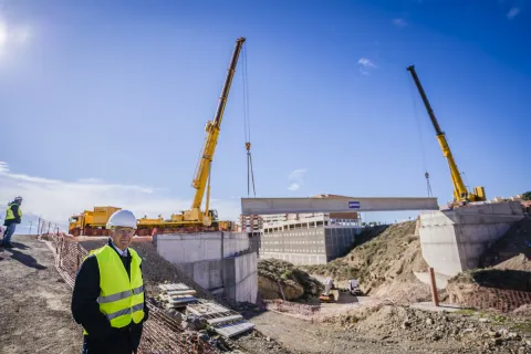 El alcalde supervisa los trabajos de izado de la primera viga del puente de la calle Galán en Aguadulce Norte