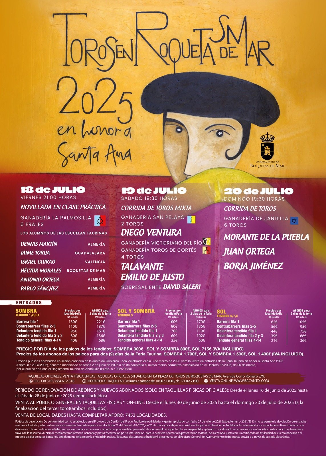 Ya ha comenzado el periodo de renovación, así como la adquisición de nuevos abonos, para asistir a las dos tardes programadas en la Feria Taurina de Santa Ana 20205 los días 19 y 20 de julio a partir de las 19:30 horas. La renovación y compra de los abonos se puede realizar hasta el próximo 28 de junio, día incluido, en las taquillas de la Plaza de Toros de Roquetas de Mar. Los abonos tienen un 15% de descuento en comparación con el precio de las entradas sueltas.