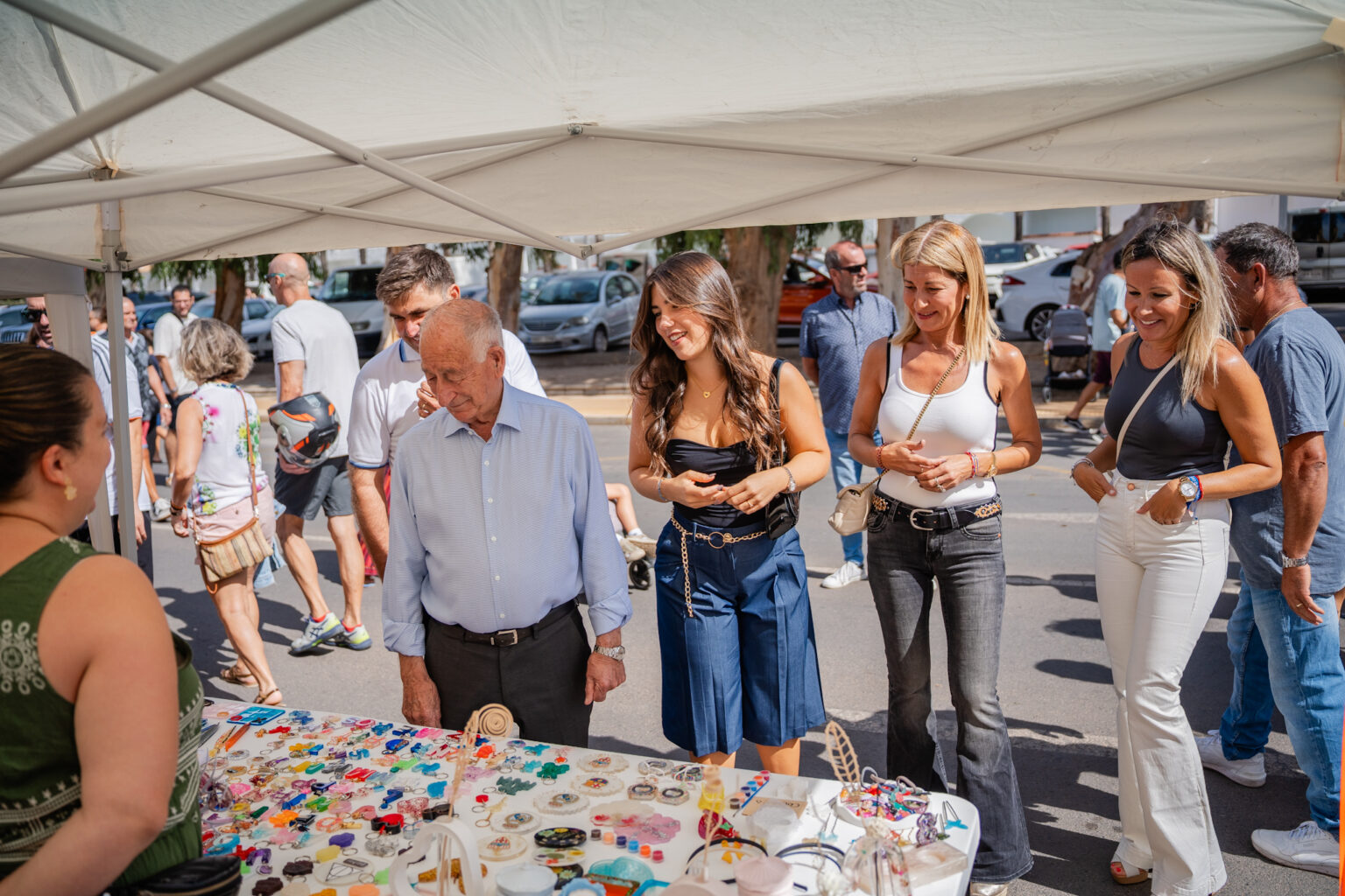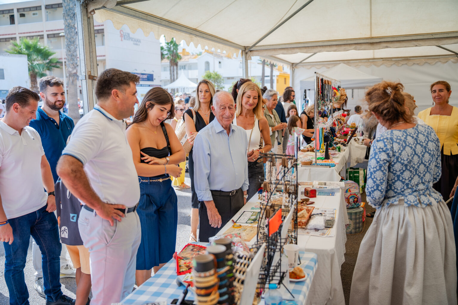 El alcalde de Roquetas de Mar, Gabriel Amat, junto con la concejal de Turismo y Playas, Amalia López y concejales del equipo de Gobierno en el Ayuntamiento han visitado esta feria que como cada año se celebra en los aparcamientos del Club Tropicana de la Urbanización.