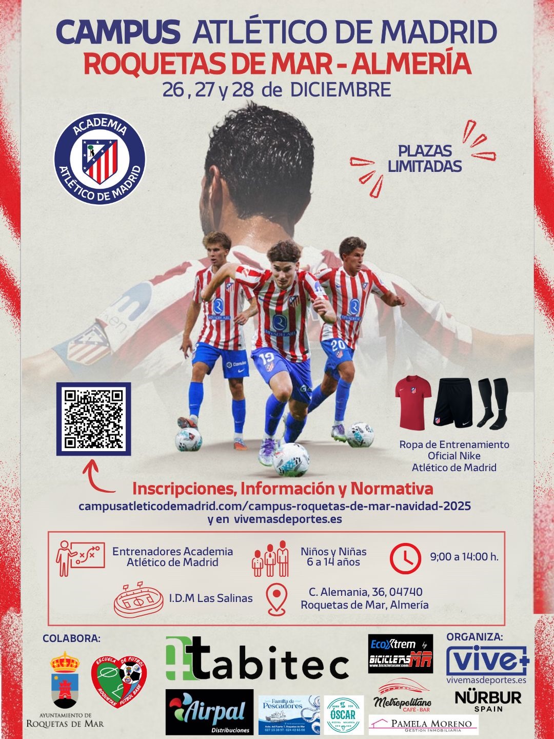 El Ayuntamiento de Roquetas de Mar, en colaboración con la Escuela Municipal de Fútbol La Escuela Municipal de fútbol de Roquetas de Mar está organizando en la orel Campus de Atlético de Madrid que se llevará a cabo los días 26, 27 y 28 de diciembre de 2025 en las Instalaciones Municipales de Las Salinas.